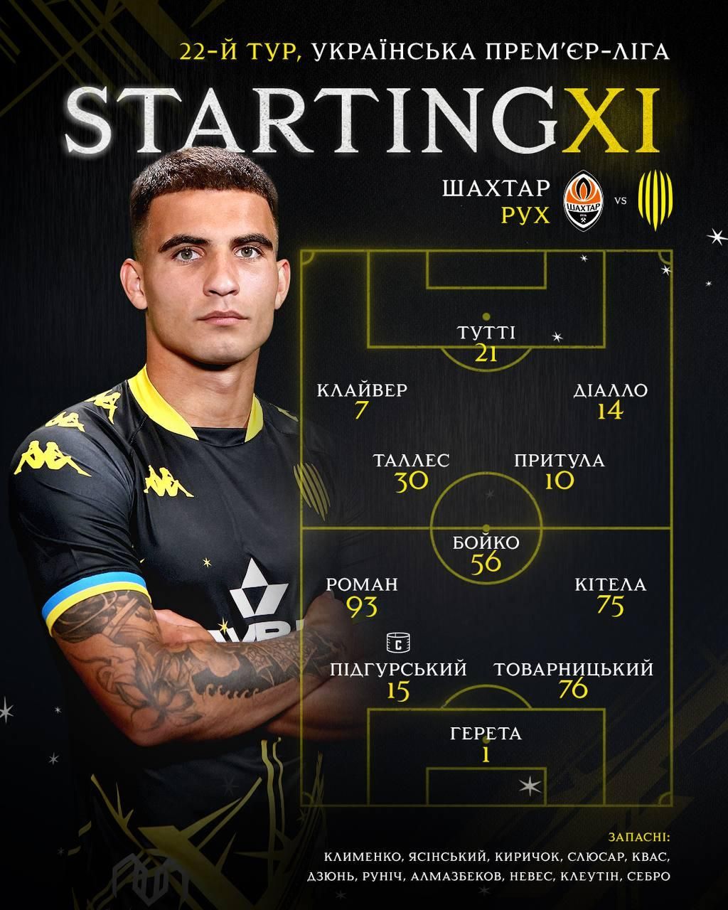 Рух: Герета – Роман, Товарницький, Підгурський, Кітела – Бойко, Притула, Таллес – Клайвер, Діалло, Тутті