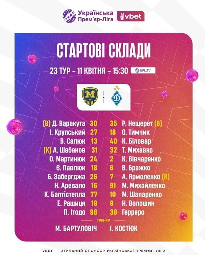 Стартовий склад Динамо: Нещерет – Тимчик, Біловар, Михавко, Вівчаренко – Бражко, Шапаренко, Михайленко – Ярмоленко, Волошин, Герреро