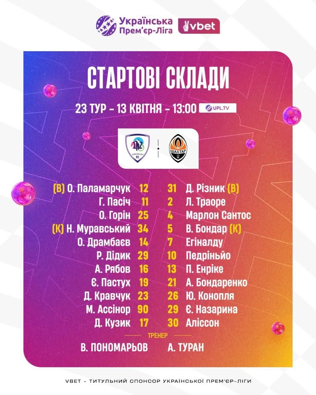 Стартовий склад Шахтаря: Різник, Траоре, Сантос, Бондар, Єгіналду, Педріньйо, Енріке, Бондаренко, Конопля, Назарина, Аліссон