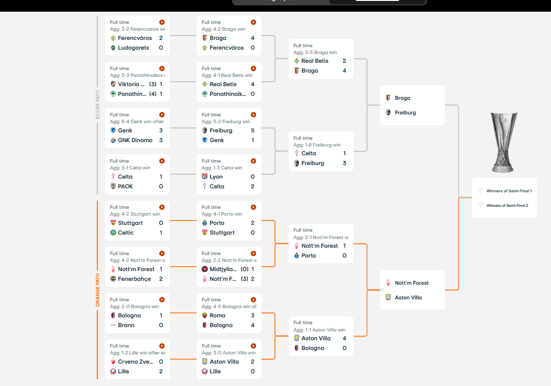 У Лізі Європи в півфіналі відбудеться англійське дербі – Астон Вілла зустрінеться з Ноттінгемом. У іншому поєдинку Фрайбург поміряється силами з Брагою.