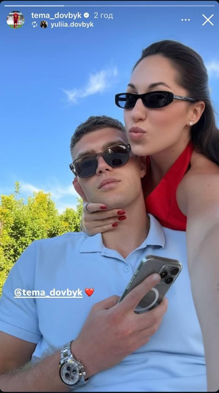 Друга половинка форварда Роми поділилась фото, на якому ніжно обійняла Артема. Довбик зробив милий жест і перерепостив цю світлину і на свою сторінку в Instagram.