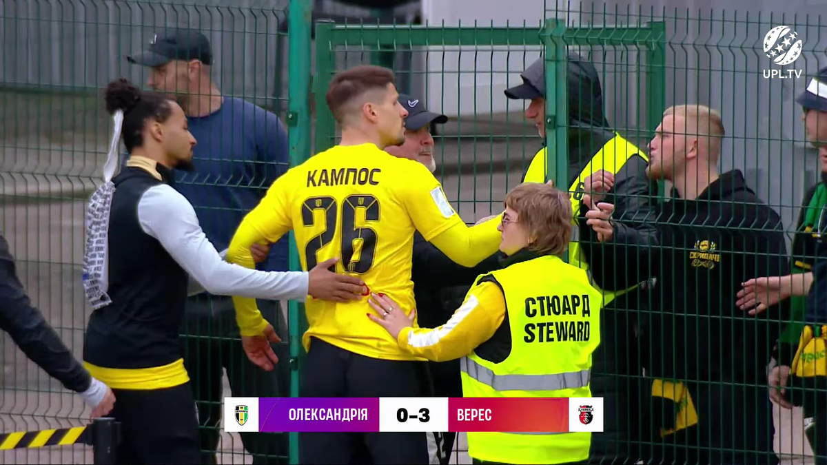 У палких фанатів команди потроху вже починає вриватися терпець, тож після матчу до них вийшов поговорити лідер Олександрії Мігель Кампос. Деталі розмови невідомі, але на кадрах із трансляції видно, що градус спілкування був високим. Футболіст хотів подати вболівальнику руку, але отримав грубого відкоша.