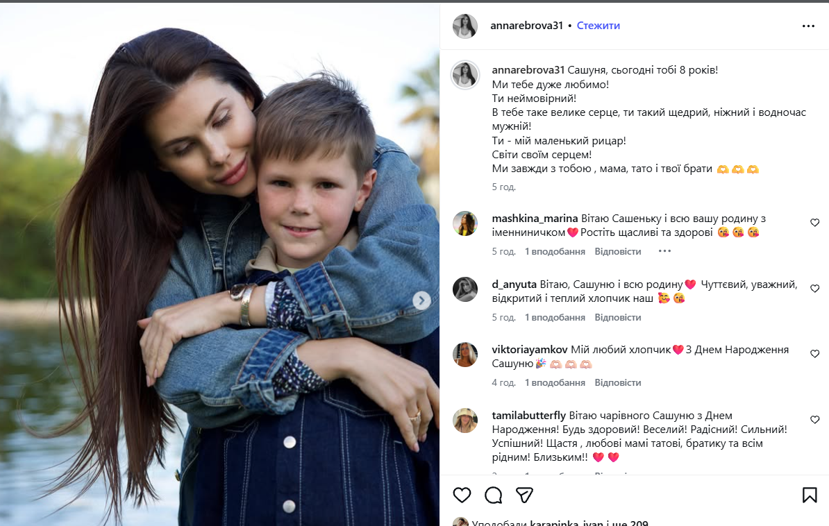 "Сашуня, сьогодні тобі 8 років! Ми тебе дуже любимо! Ти неймовірний! В тебе таке велике серце, ти такий щедрий, ніжний і водночас мужній! Ти – мій маленький рицар! Світи своїм серцем! Ми завжди з тобою, мама, тато і твої брати", – написала Анна Реброва.