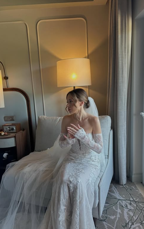 Марина з’явилася у витонченій весільній сукні, а її чоловік зупинився на класичному чорному костюмі. Прихильники одразу відзначили стиль і гармонію пари.