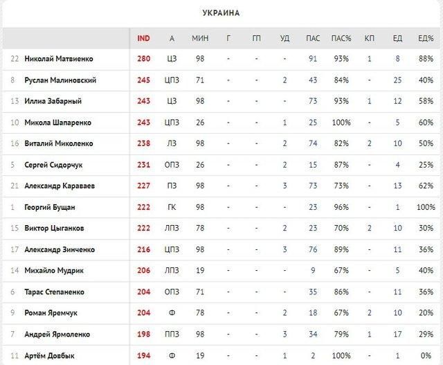 Найвищу оцінку серед українців отримав Микола Матвієнко – 280. Захисник за 98 хвилин поєдинку віддав 91 передачу з точністю 93%, а також виграв 7 єдиноборств з 8.