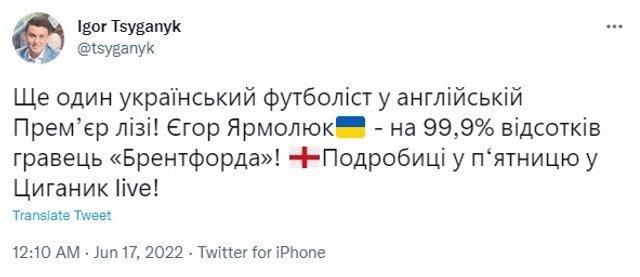 "Ще один український футболіст в Англійській Прем'єр-лізі. Єгор Ярмолюк – на 99,9 % відсотків гравець Брентфорд", – повідомив журналіст Ігор Циганик у своєму Twitter.