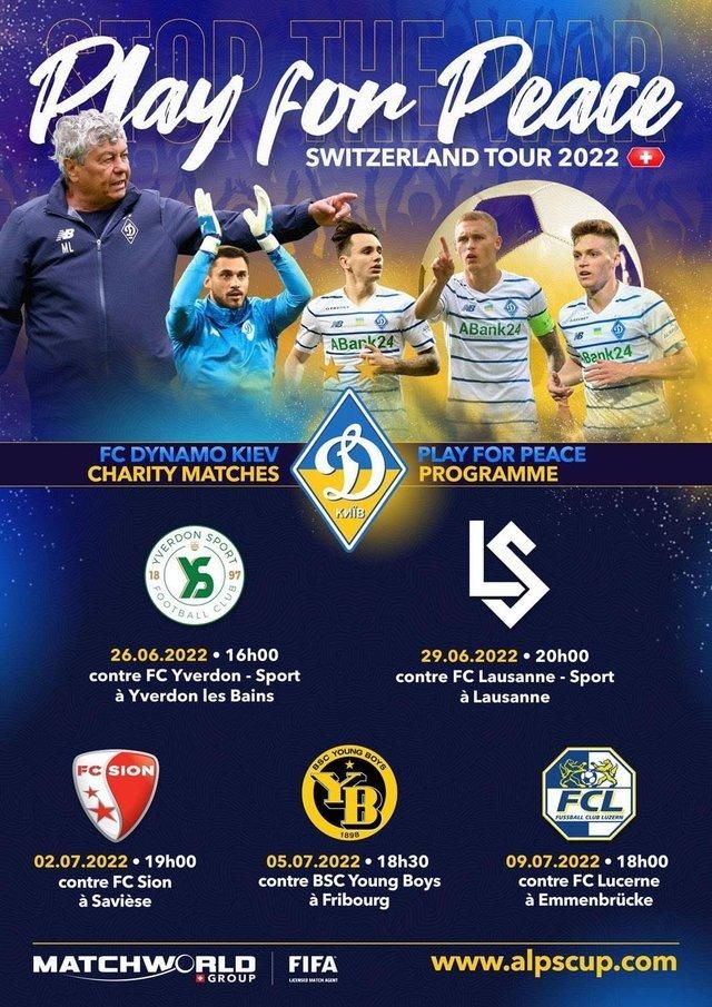Перший матч відбудеться у неділю, 26 червня, під гаслом "Грай за мир / Зупини війну!". Суперником динамівців буде місцевий Івердон-Спорт.