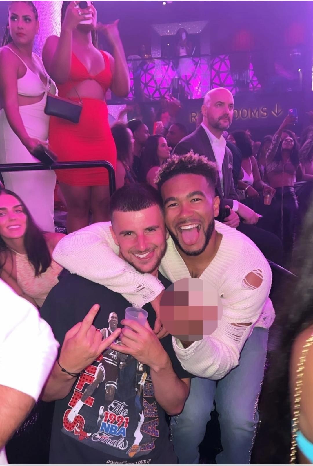 Красиві дівчата на задньому фоні, в руках склянка з невідомим напоєм, а Ріс ще й показує непристойний жест – така світлина явно не покращує репутацію статусних спортсменів.