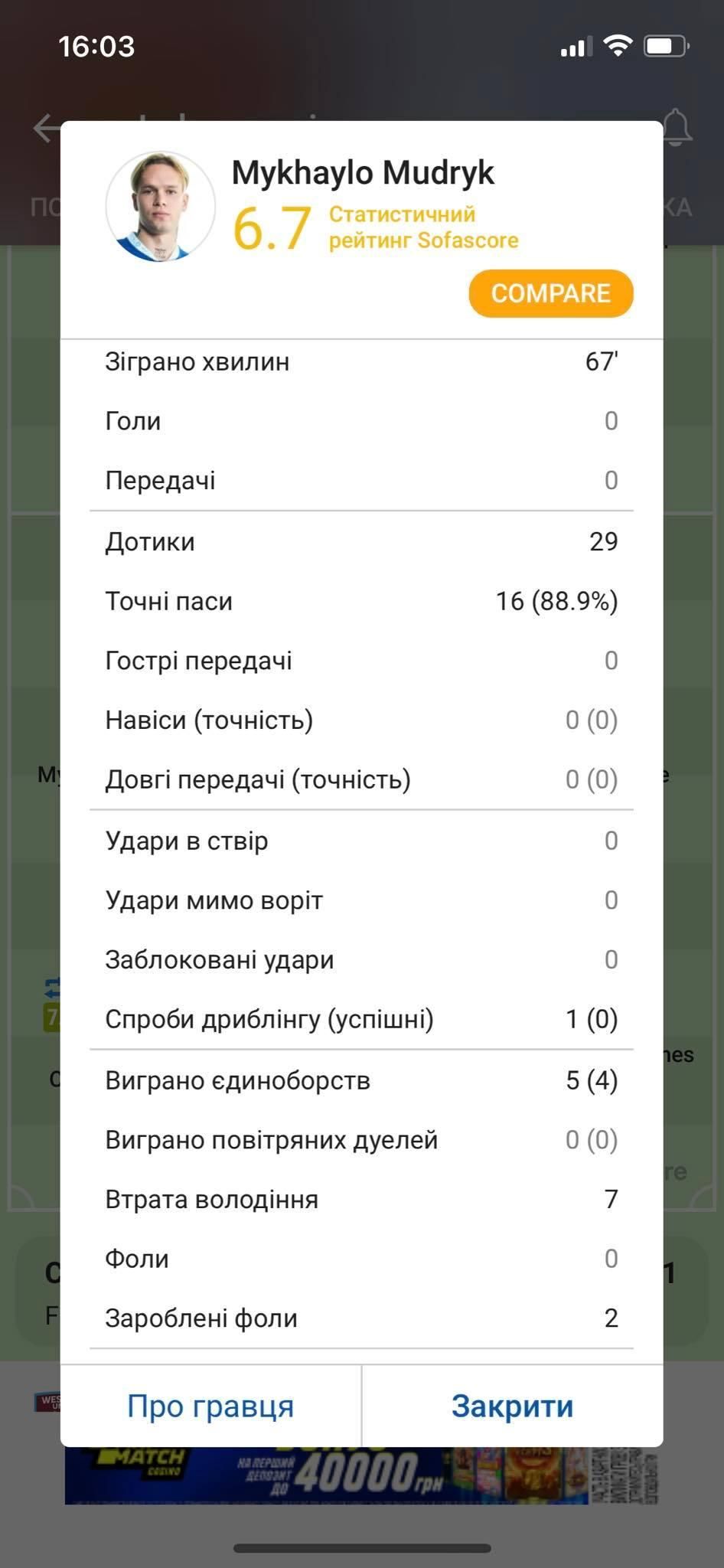 Український вінгер провів на полі 67 хвилин. У його доробку 29 дотиків, 16 точних пасів (89%), 5 виграних єдиноборств і 7 втрат володіння м'ячем.