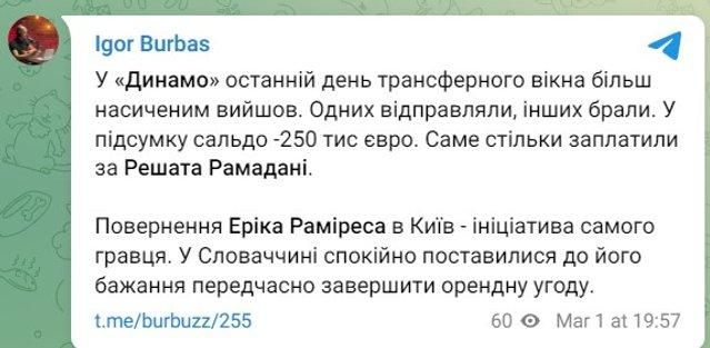 Деталями деяких угод киян поділився журналіст Ігор Бурбас. За інформацією джерела, трансфер 19-річного македонця Решата Рамадані зі Шкендії обійшовся українському клубу у 250 тисяч євро.
