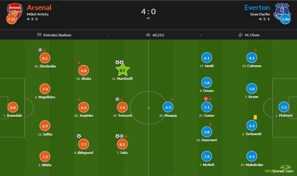 У підсумку авторитетний ресурс WhoScored оцінив дії українця у 8,1 бала. Вищі оцінки лише у авторів голів: Мартінеллі (8,5) і Сака (8,2).