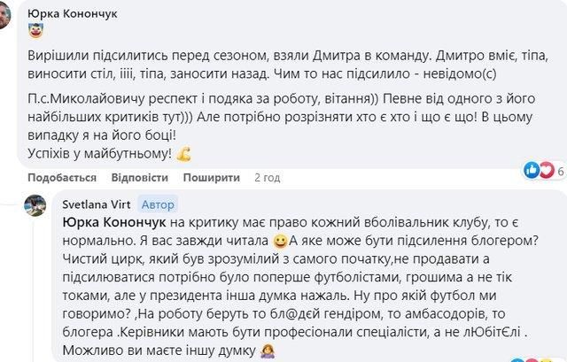 "На критику має право кожний вболівальник клубу, то є нормально... А яке може бути підсилення блогером? Чистий цирк, який був зрозумілий з самого початку. Не продавати, а підсилюватися потрібно було, по-перше футболістами, грошима, а не тік-токами. Але у президента інша думка, на жаль. Ну про який футбол ми говоримо? На роботу беруть то бл*дєй гендиром, то амбасадорів, то блогера. Керівники мають бути професіонали спеціалісти, а не любителі.