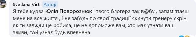 Я тебе к*рва, Юлія Поворознюк, і твого блогера так в*бу, запамʼятаєш мене на все життя. І не забудь за своєю традицією скинути тренеру скрін, як ти завжди це робила. Це не допоможе вам. Хто має дізнатися ваші зливи, той дізнається, будь впевнена", – написала Світлана у соцмережах.