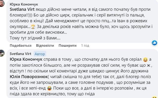 Річ у тому, що спочатку для Дмитра Поворознюка був серіал, а потім захотілося більшого. Але не розрахував свої сили. Ну буває, що ж, відступ! Через те, що мої коментарі дуже швидко цинкує його дружина Юлія Поворознюк (читай смішна, то для тебе)... Так от, далі блогер поліз куди його не запрошували, а найголовніше подумав, що розумніший за всіх. І все – хепі-енд. Поки що все, а далі в інтервʼю розповім, як ця гнида здала все керівництво, тому що гнида.