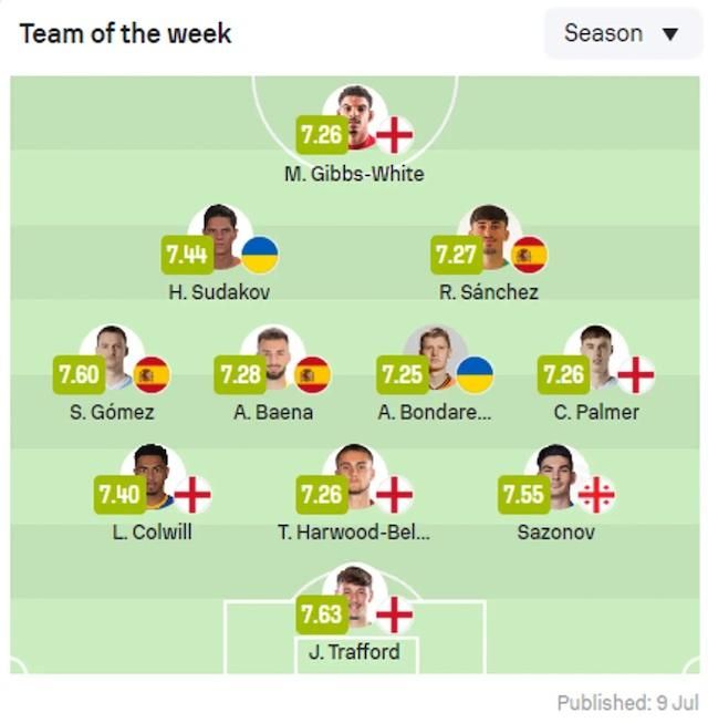 Найкраща одинадцятка виглядає наступним чином: Джеймс Траффорд (Англія), Леві Колвілл (Англія), Тейлор Гарвуд-Белліс (Англія), Саба Сазонов (Грузія), Серхіо Гомес (Іспанія), Алекс Баена (Іспанія), Артем Бондаренко (Україна), Коул Палмер (Англія), Родрі Санчес (Іспанія), Георгій Судаков (Україна) та Морган Гіббс-Вайт (Англія).