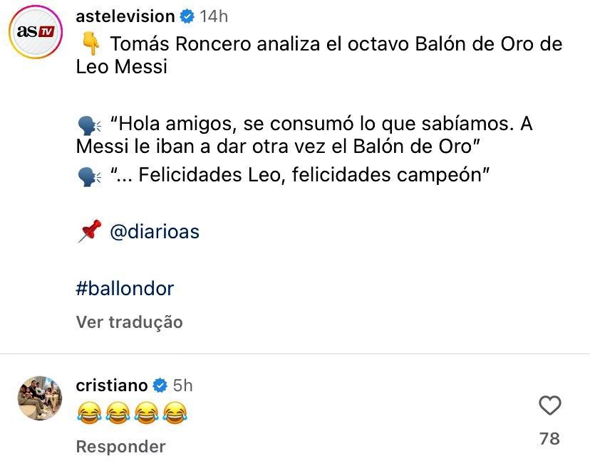Роналду у коментарях під відео відреагував на це трьома емодзі, які плачуть від сміху. До слова, сам Кріш цього разу вперше за останні 20 років не потрапив навіть у топ-30 футболістів. В колекції португальця п'ять "Золотих м'ячів".