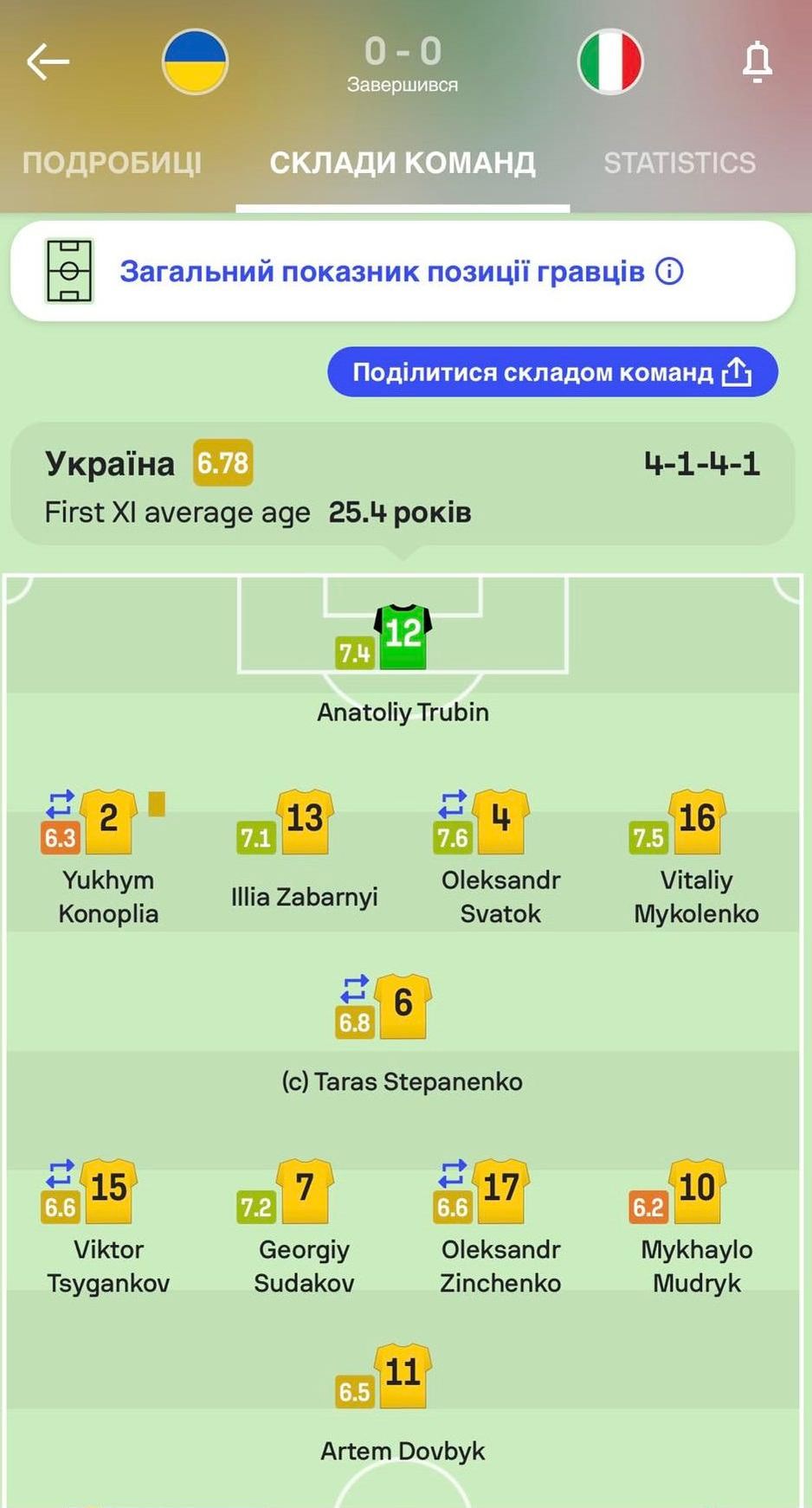 Також цей портал високо оцінив гру захисника Віталія Миколенка (7,5) і воротаря Анатолія Трубіна (7,4). Натомість найнижчий бал дістався Михайлові Мудрику (6,2).