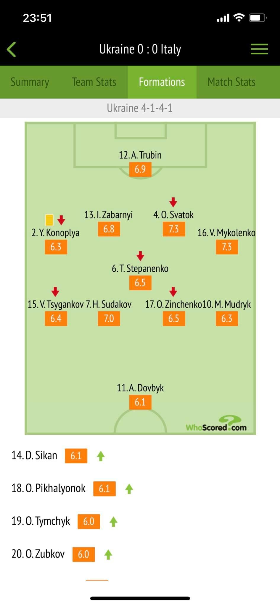Who Scored також поставив найвищий бал Сватку – 7,3 бала, Миколенко отримав аналогічну оцінку. Найневтішніший показник – у форварда Артема Довбика (6,1).
