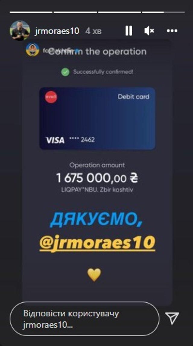 Екс-форвард збірної України перерахував нашій армії 1,675 млн гривень. Скрін оплати натуралізований бразилець виклав в Instagram.