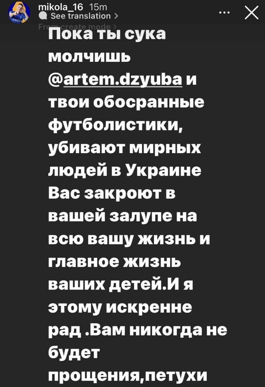 "Поки ти, су*а, мовчиш, Артьоме Дзюба і твої обіср*ні футболістики також, в Україні вбивають мирних людей.