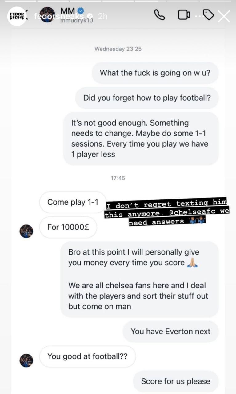 Вболівальник "пенсіонерів" та відомий у Британії реселлер Fedor Sneaks виклав скриншот листування з Михайлом Мудриком після поразки Челсі у матчі з Вулверхемптоном (2:4) з таким підписом: "Більше не шкодую, що написав йому це. Челсі, нам потрібні відповіді".