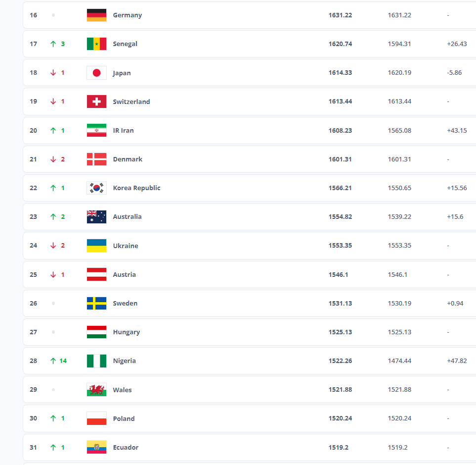 Команда Реброва втратила дві позиції і тепер посідає 24-те місце. "Синьо-жовті" мають у своєму активі 1553,35 бала. Серед представників УЄФА збірна України перебуває на 12-й позиції.