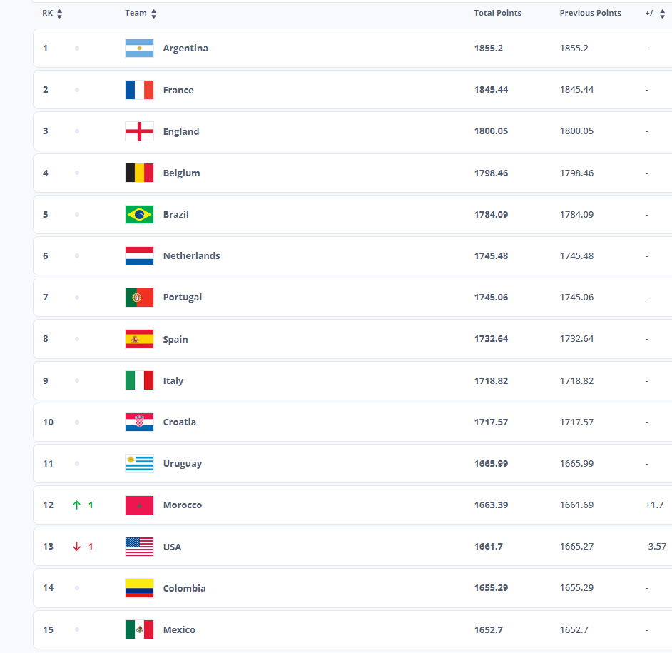 Лідером світового рейтингу залишається Аргентина. Суперник "альбіселестес" по фіналу ЧС-2022 – Франція – йде другою. А замикає трійку лідерів збірна Англії.