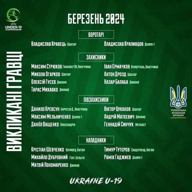 Виклик отримали 20 футболістів (у тому числі два воротарі). Одним з шести легіонерів став Крістіан Шевченко – син президента УАФ та володаря "Золотого м'яча" Андрія Шевченка. Форвард Уотфорда мав право також виступати за США чи Англію, але обрав Україну.