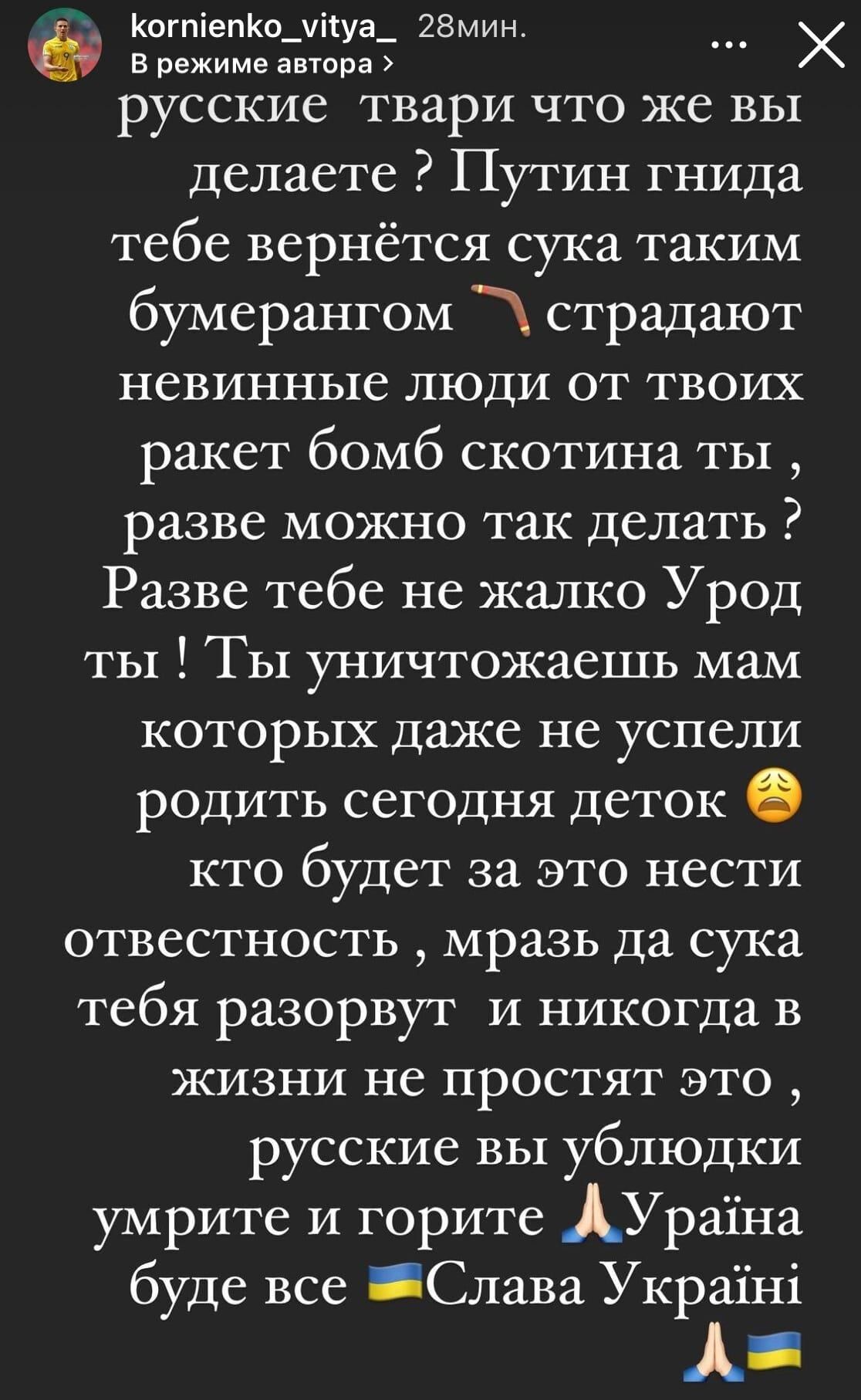 Росіяни, ви – виродки, помріть і горіть. Україна буде все. Слава Україні", – написав Корнієнко.