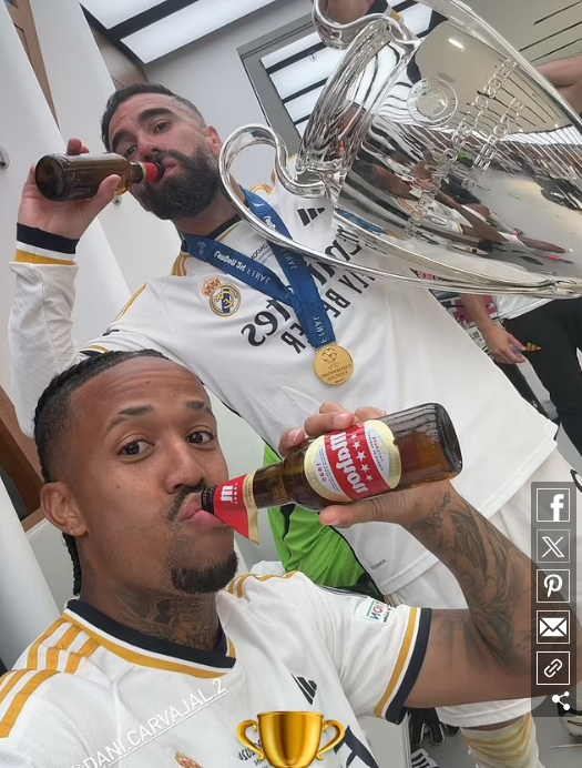 Свято продовжилося у роздягальні. Там Едер Мілітао і Дані Карвахаль знайшли час випити по пляшці пива, а Родріго підкріпився кавуном та ізотонічним напоєм.