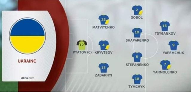 Лінію оборони в тому поєдинку складало тріо найкращих тогочасних українських захисників – Забарний, Кривцов та Матвієнко. Степаненко та Шапаренко осіли в центрі поля, на флангах Тимчик і Соболь, а під Яремчуком – Ярмоленко і Циганков. Загалом вийшли ті ж футболісти, що і проти Фінляндії. Той самий склад на два матчі з перервою у декілька днів…