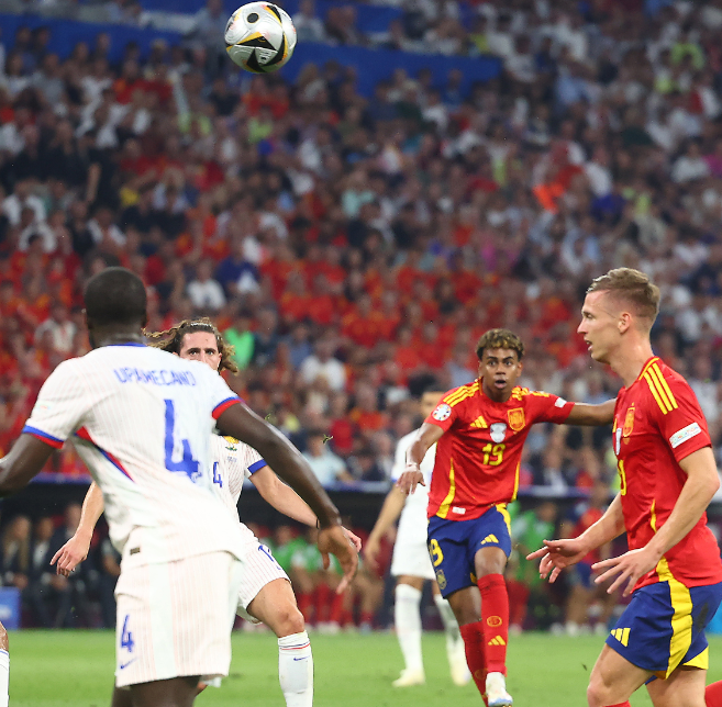 Іспанія краще розпочала поєдинок і вже на 5 хвилині могла виходити вперед. Ямал у своєму стилі акуратно закинув на дальню стійку, де першим вистрибнув Фабіан Руїс, але влучити головою не зумів. Французів врятували лічені сантиметри.