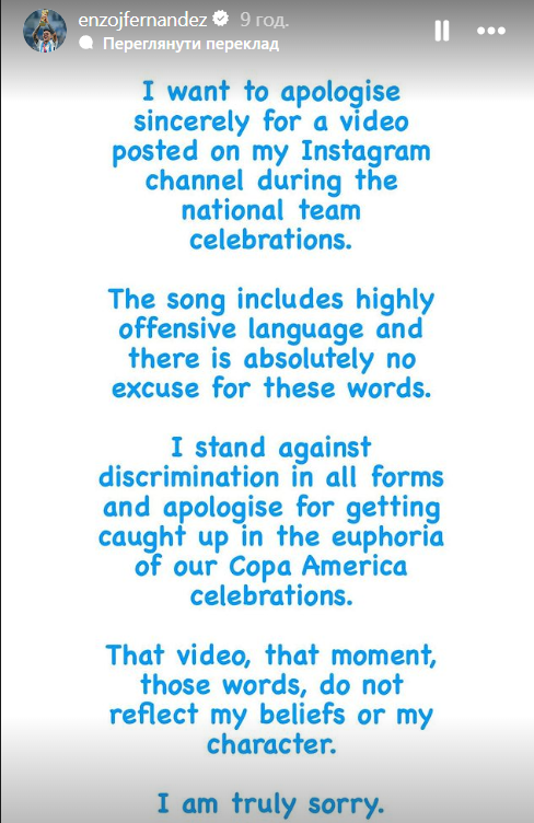 Я проти дискримінації у всіх формах і вибачаюся за те, що потрапив у ейфорію святкування перемоги на Копа Амеріка. Це відео, той момент, ці слова, не відображають моїх переконань або мого характеру. Мені щиро шкода", – написав Енцо на своїй сторінці в Instagram.