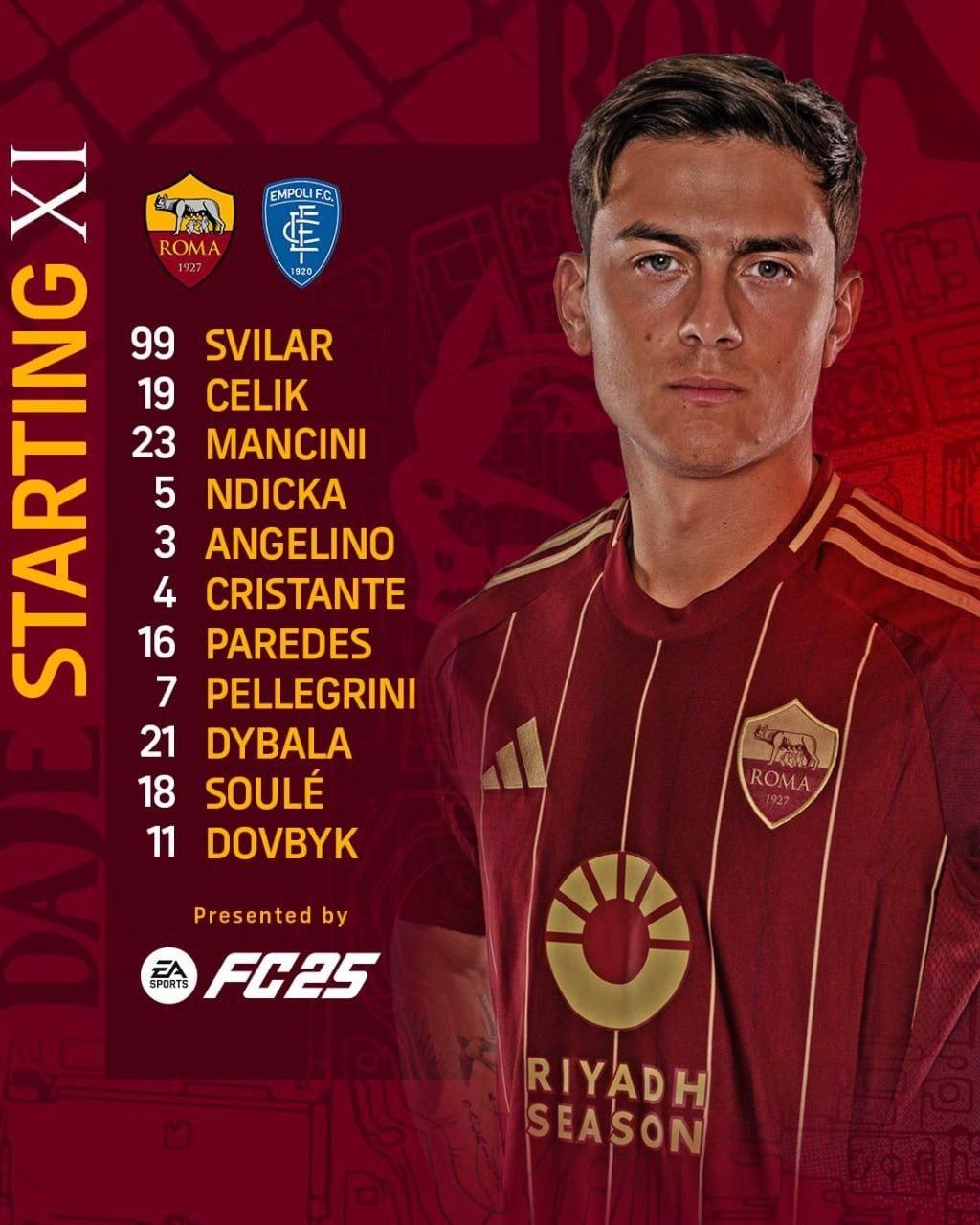 Стартовий склад Роми: Свілар – Челік, Манчіні, Н'Діка, Анхеліньо – Паредес, Крістанте, Суле, Дибала, Пеллегріні – Довбик