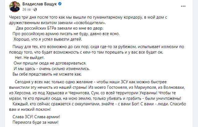 Кожен, хто зараз бореться з окупантами, знайте – з вами Бог! З вами – люди. Дякую вам і низький уклін! Слава ЗСУ! Слава армії! Перемога буде за нами!" – написав Ващук на своїй сторінці у Facebook.