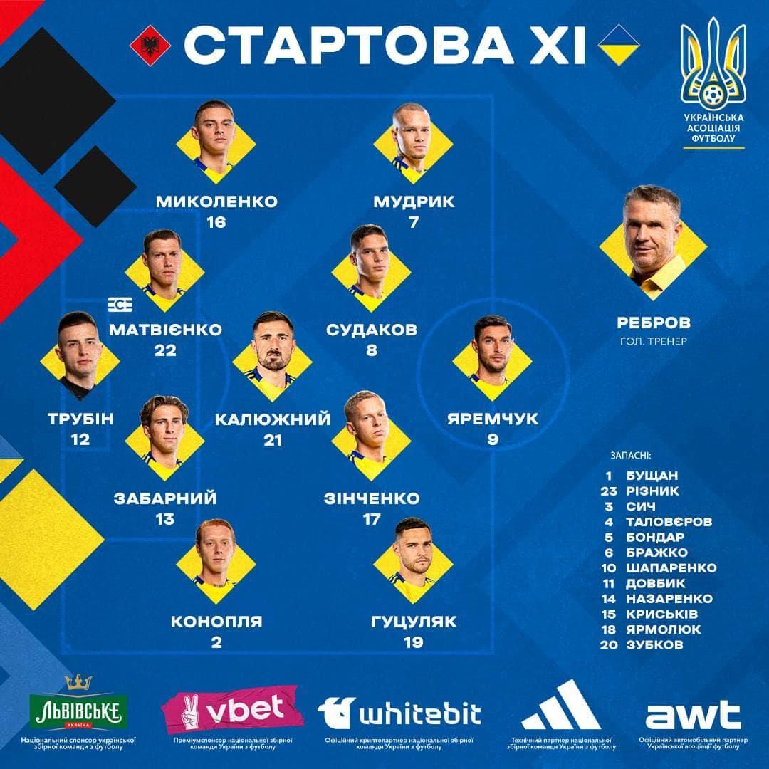 Головний тренер Сергій Ребров визначився зі стартовим складом збірної України на матч проти Албанії. Про це повідомили на офіційній сторінці УАФ в Telegram.
