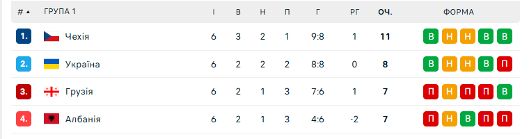 У паралельному матчі Чехія з таким самим рахунком здолала Грузію (2:1). Як наслідок, Україна набрала 8 очок, фінішувала другою і боротиметься у стикових матчах за вихід в еліту Ліги націй.