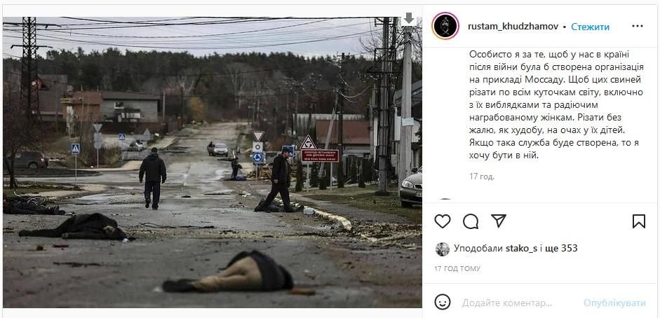 Різати без жалю, як худобу, на очах у їхніх дітей. Якщо така служба буде створена, то я хочу бути в ній", – написав Худжамов.
