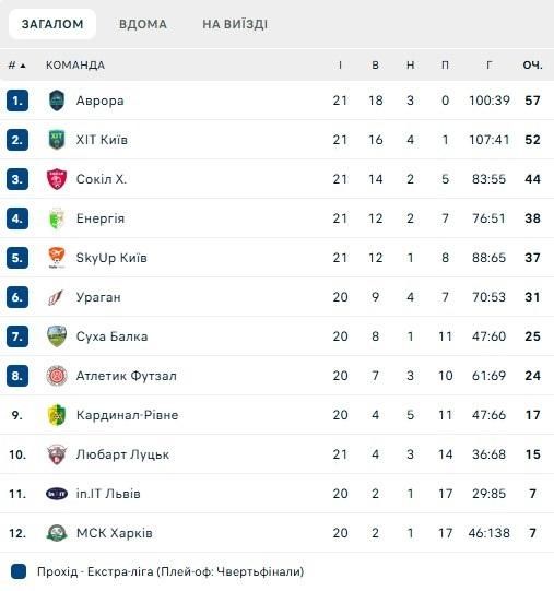 У футзальній Екстра-лізі за тур до завершення визначився переможець регулярного чемпіонату. Ним вперше в історії стала столична Аврора, яка пройшла дистанцію без поразок і лише в трьох матчах задовольнилася нічиїми.