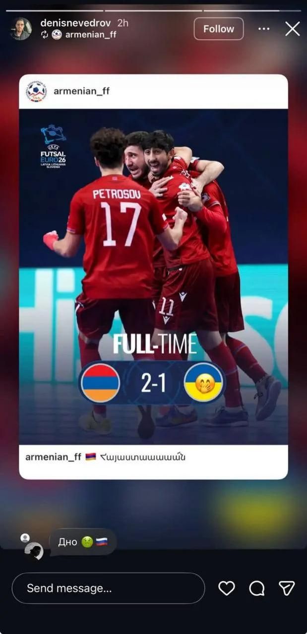 Уродженець росії, якого натуралізували за збірну Вірменії у 2021 році, висміяв Україну після перемоги в стартовому матчі чемпіонату Європи з футзалу. Він російською мовою прямо на майданчику викрикнув у камеру: "Лохи Україна. Лохи нах*й".