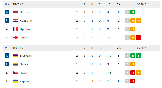 Збірна України гарантовано не посяде перше місце в своєму квартеті. Вірменія після перемоги над "синьо-жовтими" обіграла Чехію і гарантувала собі вихід у плей-офф.