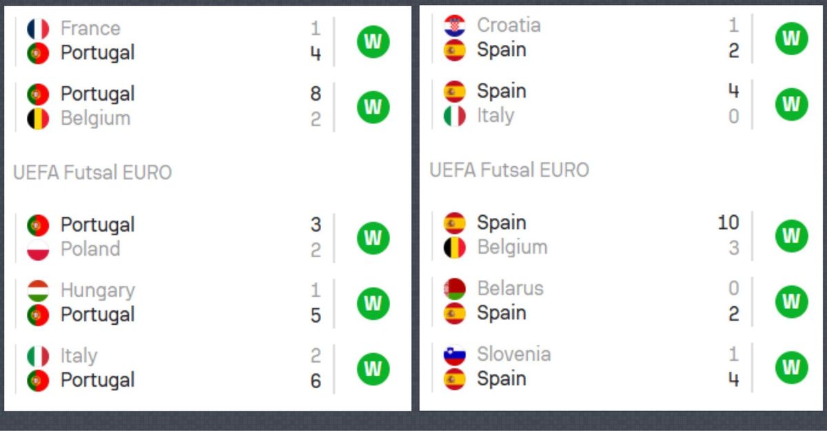 Саме з Іспанією португальці зіграли перший матч у історії футзальної збірної – поступились 0:4 у 1987 році. Загалом на Євро вони зустрічалися між собою 9 разів, зокрема двічі у фіналі. Іспанія перемогла 6 разів, двічі успіх був на боці Португалії, а один поєдинок завершився нічиєю.