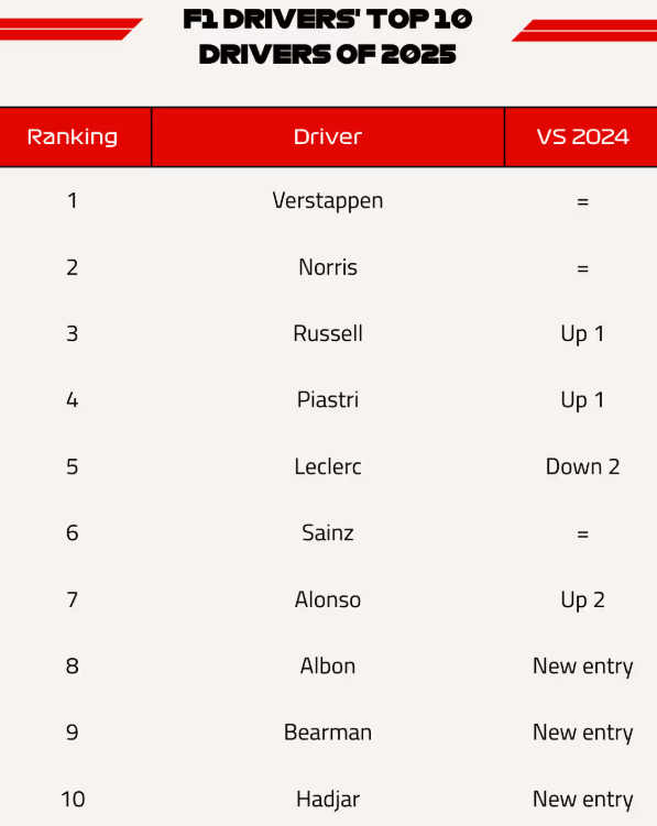 Гонщики склади власну топ-10 та використовували ту ж систему, що й у Формулі-1. Ферстаппен отримав 25 очок від шести різних пілотів, що й забезпечило йому лідерство. Третє місце у представника Мерседес Джорджа Рассела, четвертим став напарник Норріса – Оскар Піастрі.