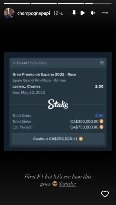 Цього разу Дрейк вирішив похизуватися знаннями у Формулі-1. Він поставив 300 тисяч доларів на те, що Шарль Леклер стане переможцем гран-прі Іспанії. Канадець міг виграти 750 тисяч.