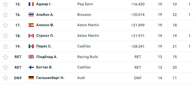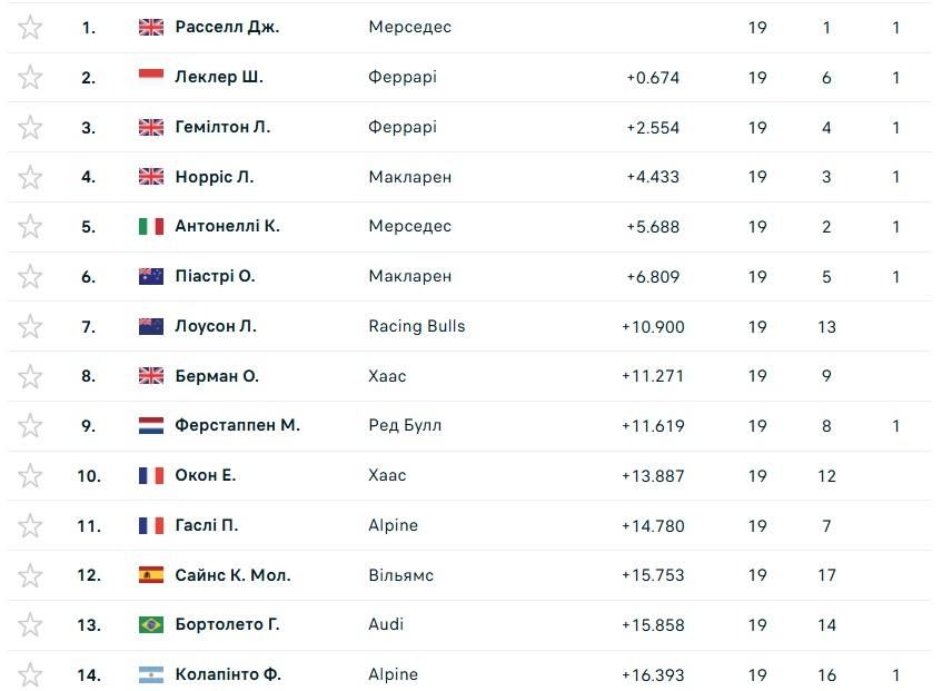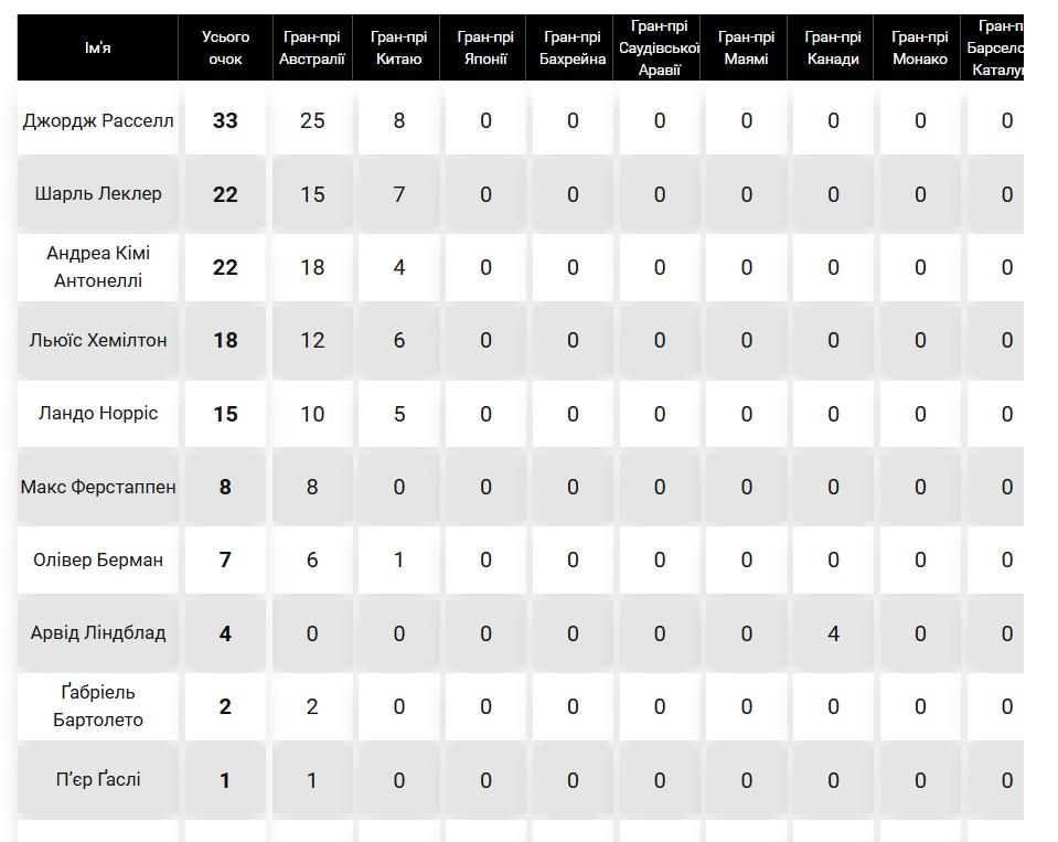 Отож, після Гран-прі Австралії та спринту Гран-прі Китаю у загальному заліку пілотів лідирує Джордж Рассел. Другим іде Шарль Леклер, на третьому щаблі перебуває Андреа Кімі Антонеллі.