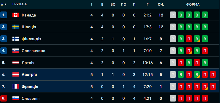 Австрія розгромила Францію (5:2). Фактично, долю поєдинку було вирішено ще в першому періоді, коли австрійці забили тричі й не пропустили. Лише в середині третього періоду французи відіграли одну шайбу, але в підсумку Австрія однаково здобула комфортну перемогу і продовжує боротися за плей-офф.