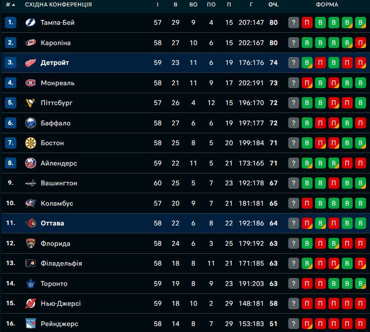 Лідер Сходу Тампа-Бей несподівано програла Кароліні (4:5). Матч був доволі напруженим. Під кінець другого періоду "блискавки" відігралися, але в вирішальній 20-хвилинці пропустили п'яту шайбу та поступилися Кароліні. Наразі обидві команди з 80 балами ділять 1-2 місце Східної конференції.