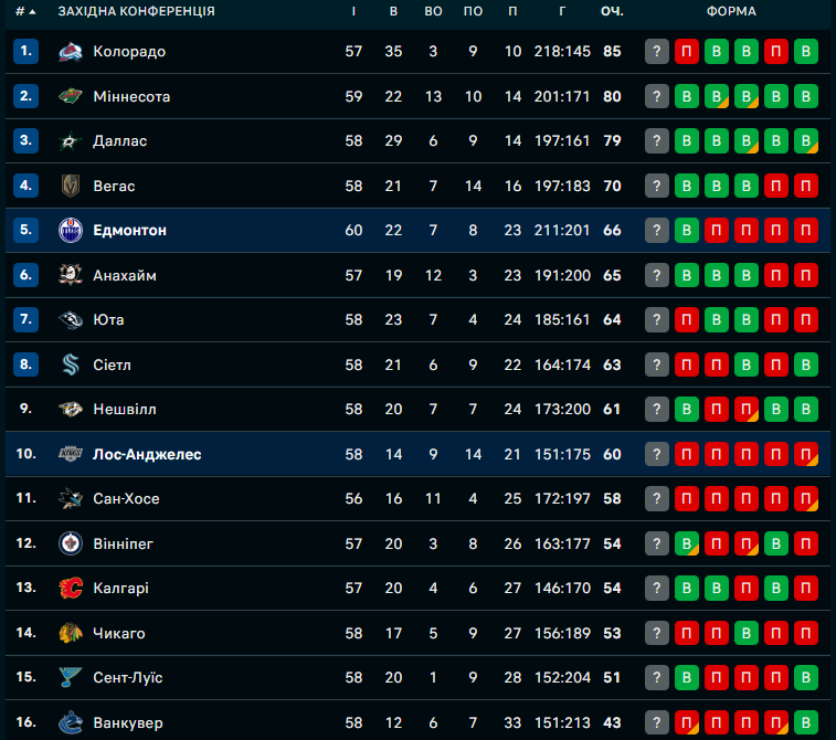 Колорадо, який домінує на Заході, теж сенсаційно програв – Міннесоті (2:5). Перший період завершився без шайб, а у другій та третій 20-хвилинці один з лідерів НХЛ нічого не зміг протидіяти та пропустив одразу 5 шайб. Втім, попри поразку у Колорадо (85 балів) є солідна перевага над другим місцем (+5 очок).