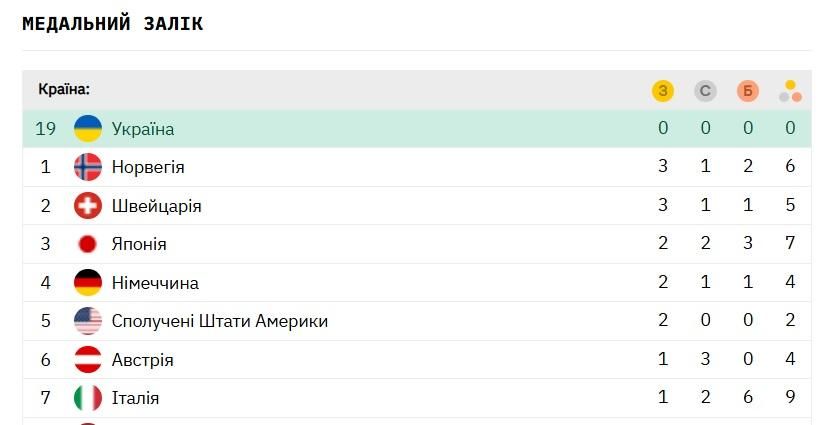 Топ-3 замикає Японія: спортсмени Країни Вранішнього Сонця вже вибороли сім нагород – дві золоті, дві срібні та три бронзові. За загальною кількістю медалей їх випереджає лише господарка Ігор – Італія, у якої дев'ять нагород, хоча у загальному заліку вона поки що лише сьома.