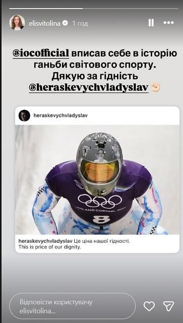 Еліна Світоліна у своєму Instagram написала: "МОК вписав себе в історію ганьби світового спорту. Дякую за гідність, Владиславе".
